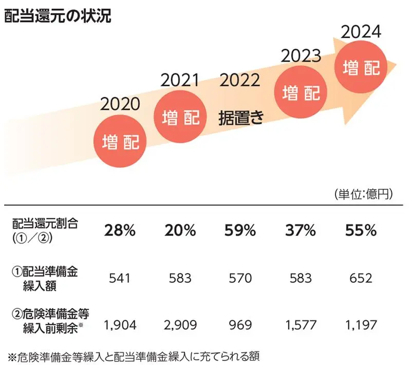 2024年度決算に基づく社員配当については、足もとの金利環境や資産運用利回りの上昇を踏まえ、利差益配当の増配を行っており、配当還元割合は55%となっています。