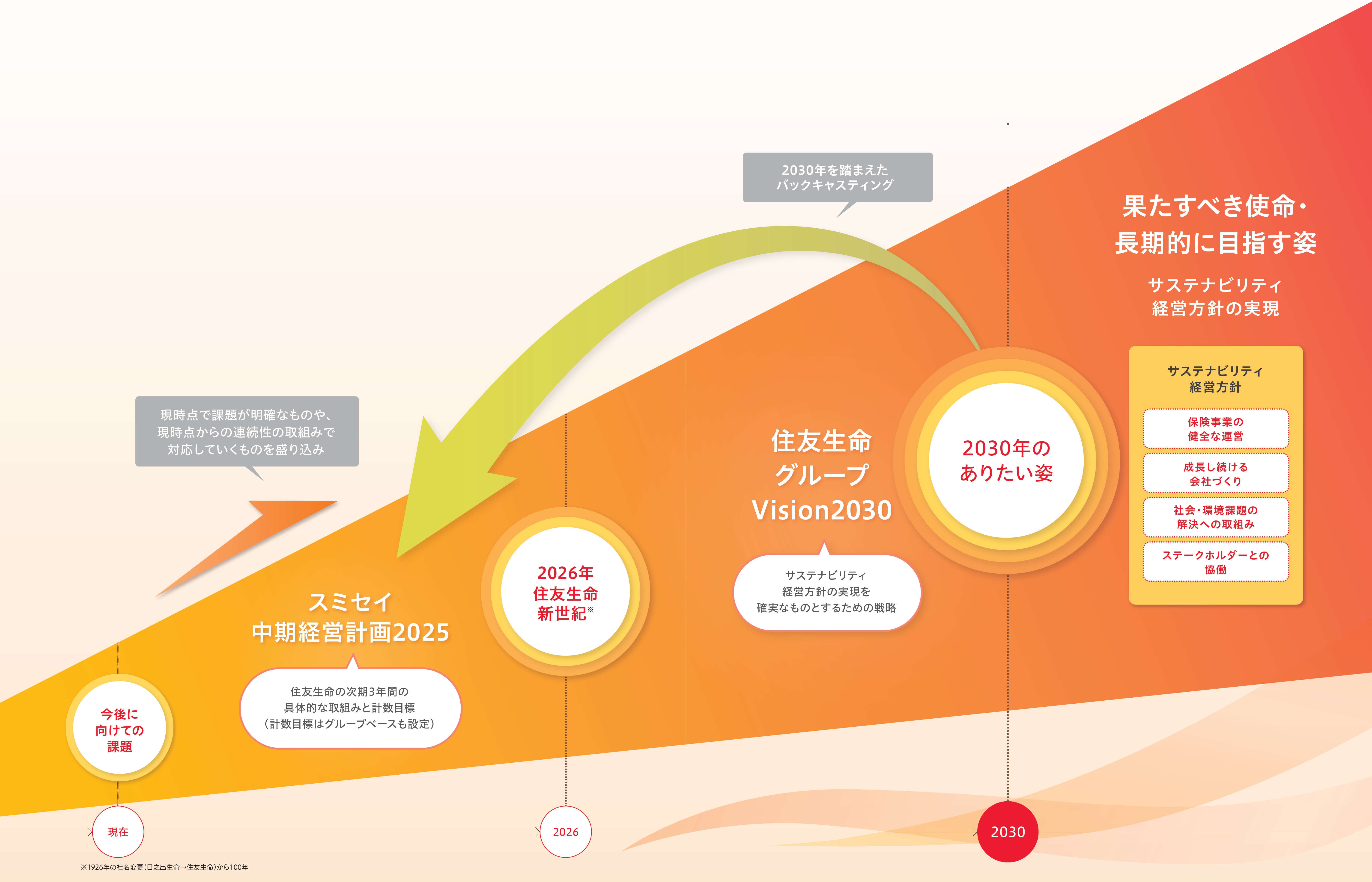 そのため、2030年のありたい姿とそれに向けた戦略を明確にしたうえで「住友生命グループVision2030」として掲げ、グループとしてのありたい姿の実現に向け、次の3年間において住友生命で取り組むことをバックキャスティングして、「スミセイ中期経営計画2025」として定めました。