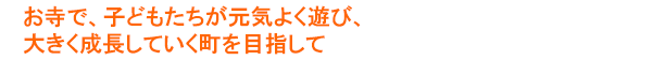 昔は当たり前だった、お寺の境内で子どもたちが元気に遊ぶ姿や声が、この地域には戻りつつあります。現在、市内の3つの地域で活動を展開していますが、こうした成果が評判を呼び、他の地域のお寺からも、てらっこ開催のオファーが来ています。まずは「てらっこを市内の各地域に1つずつ」を目標に、ゆくゆくは、お寺を拠点にした地域づくりの試みを全国に広げていきたいと考えています。