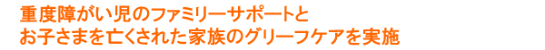 近年、重度の障がいを持った子どもたちが、日常的に医療的なケアを受けながら自宅で過ごすケースが増えています。私たちは、そうしたご家庭に対して看護師などの資格を有したボランティアスタッフを派遣し、子どもたちの見守りや送迎のお手伝いをする活動(ファミリーサポート事業と呼んでいます)を行っています。同時に、お子さまを亡くされたご家族のケアにも取り組んでおり、グリーフケアの啓発を行っています。