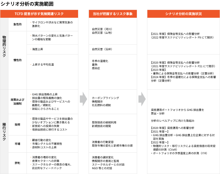 当社では、TCFD提言に基づき、気候関連リスクによる生命保険事業への影響のうち、まずは保険金等支払および資産運用への影響を対象に2020年度からシナリオ分析を実施しています。