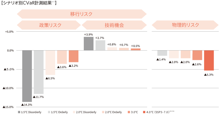 気候関連リスクによる資産運用事業への影響については、MSCI社のCVaR(Climate Value at Risk)を用いて、気候変動が資産ポートフォリオに及ぼす影響度を定量的に確認しています。本手法は、気温上昇シナリオごとに気候変動による各企業の株式や債券の毀損率を示す手法です。
