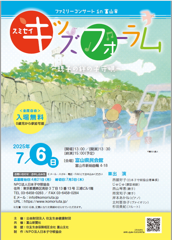 親子の絆・家庭の絆を、私たちの心の原点である「子守唄」を通じて見つめ直すことで、子育て支援の一助としたいと考えています。
