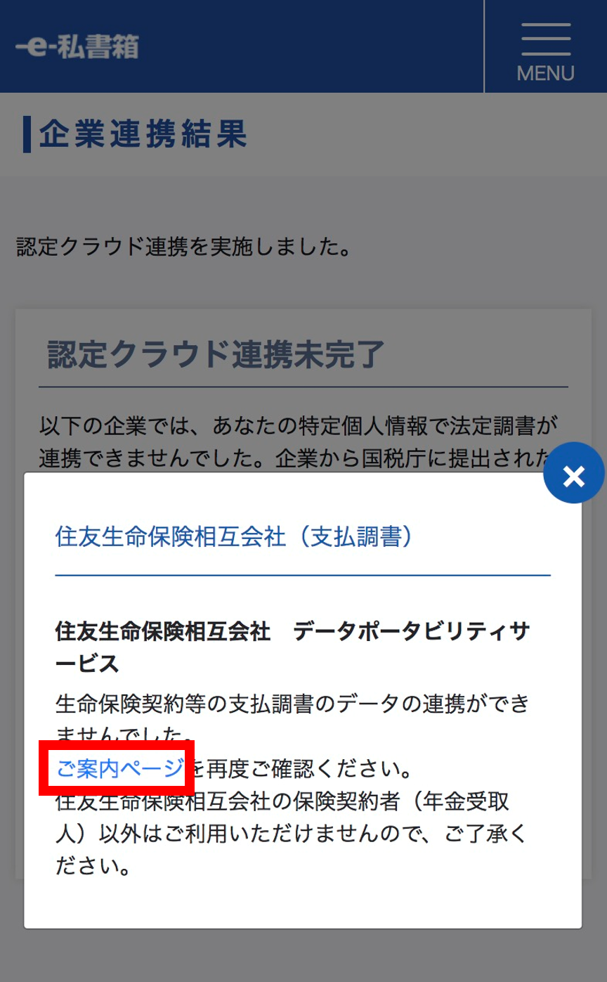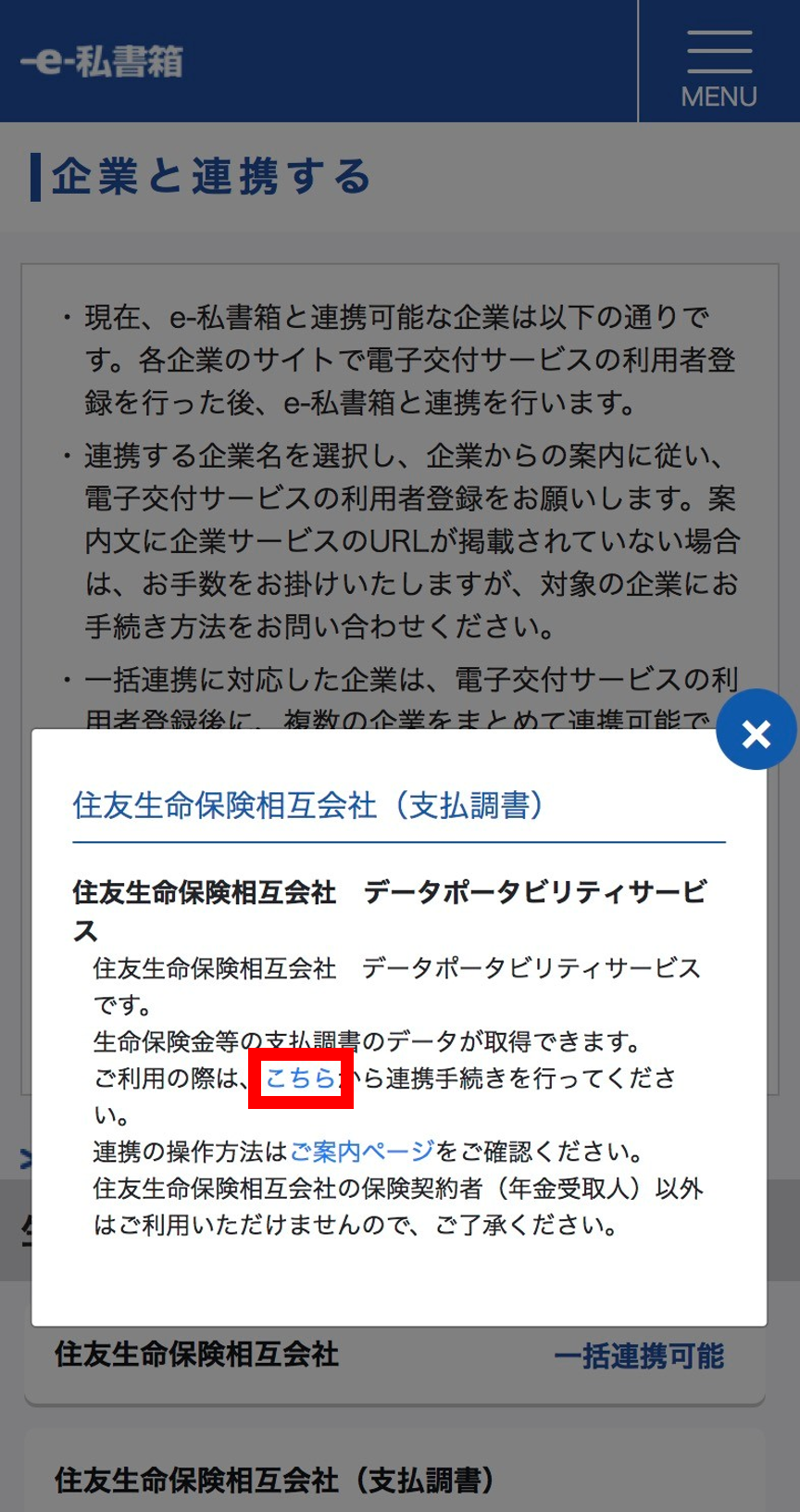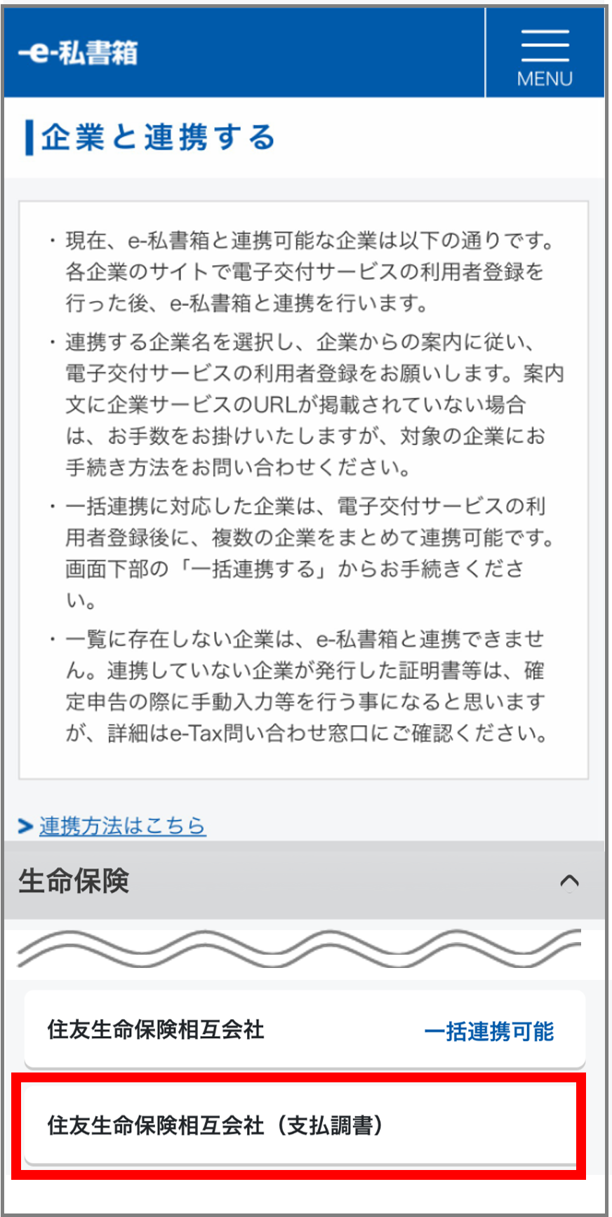 企業と連携する画面で、「住友生命保険相互会社(支払調書)」を選択ください。