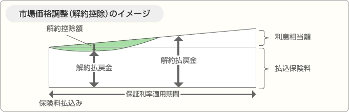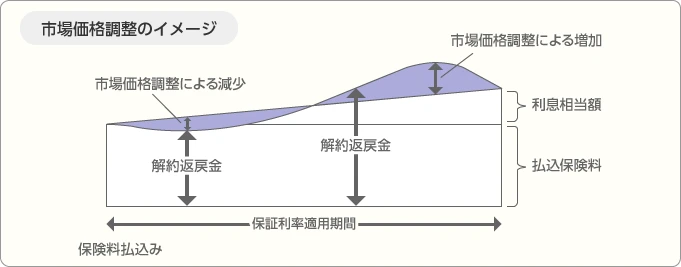 - 市場価格調整とは、市場金利の変動に応じた運用資産の価値の変動を解約返戻金額に反映させるための手法です。解約返戻金の計算に際して、その時の市場金利に応じて計算される運用資産の時価と、契約日から解約返戻金計算基準日までの間に適用された利率から計算された保険料積立金との乖離を調整します。その結果、市場金利により、解約返戻金額が保険料積立金より増加または減少することがあり、お支払いする金額が払込保険料合計を下回ることもあります。