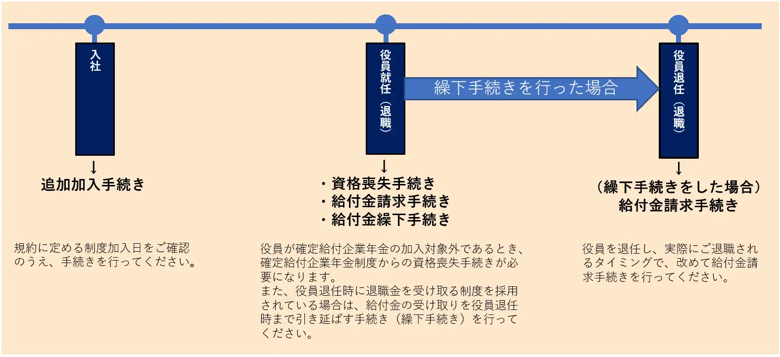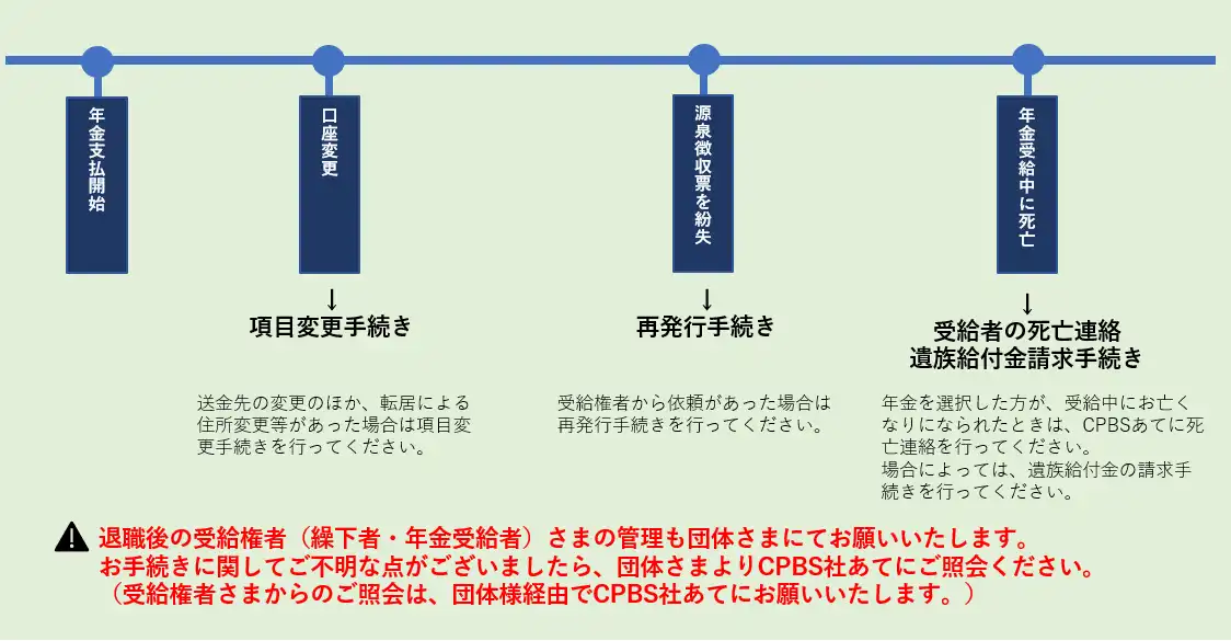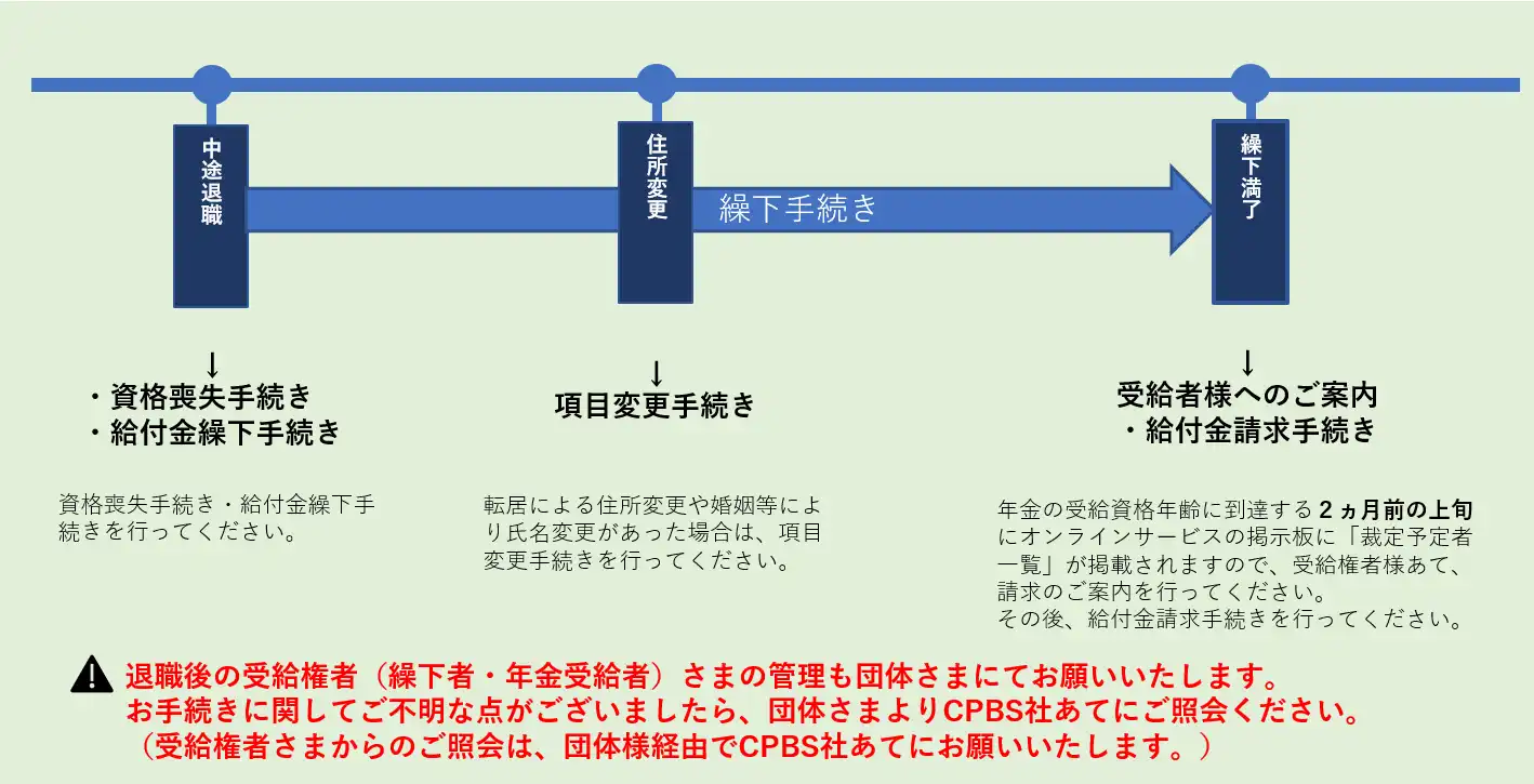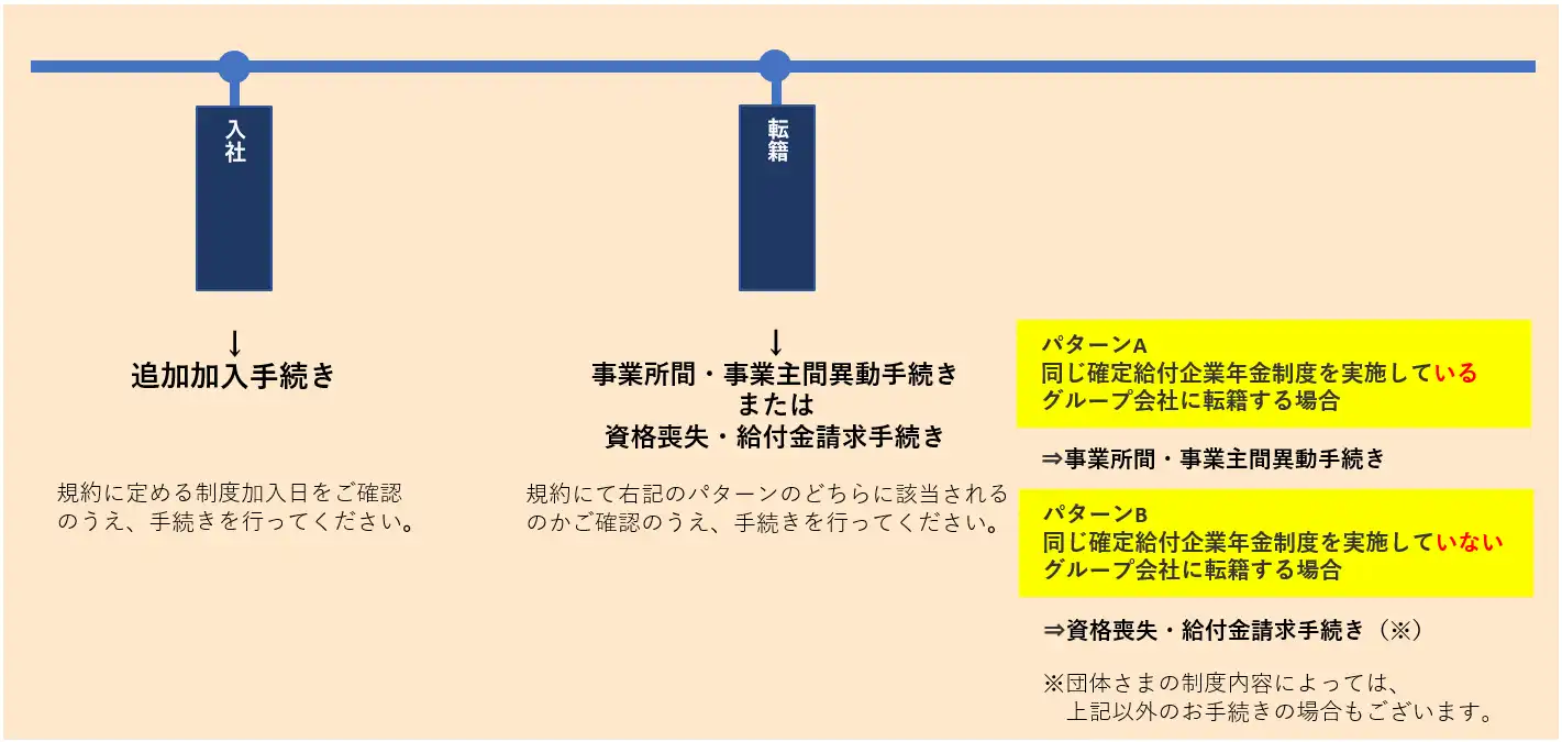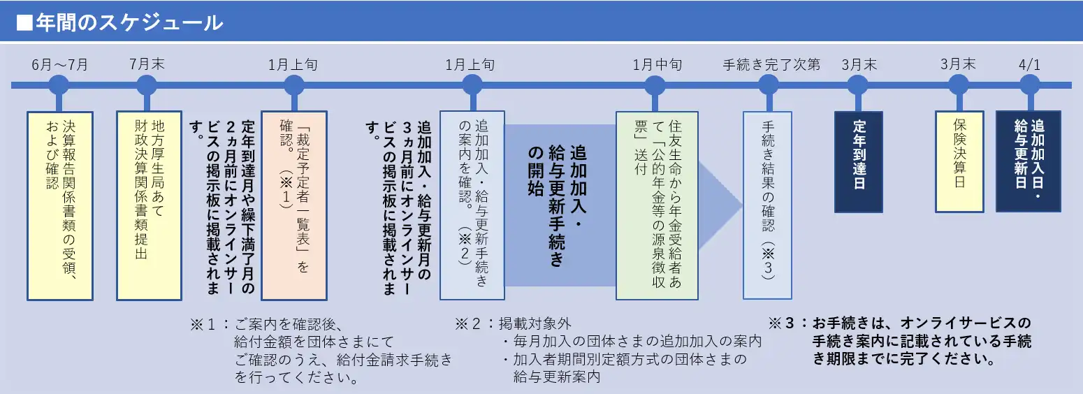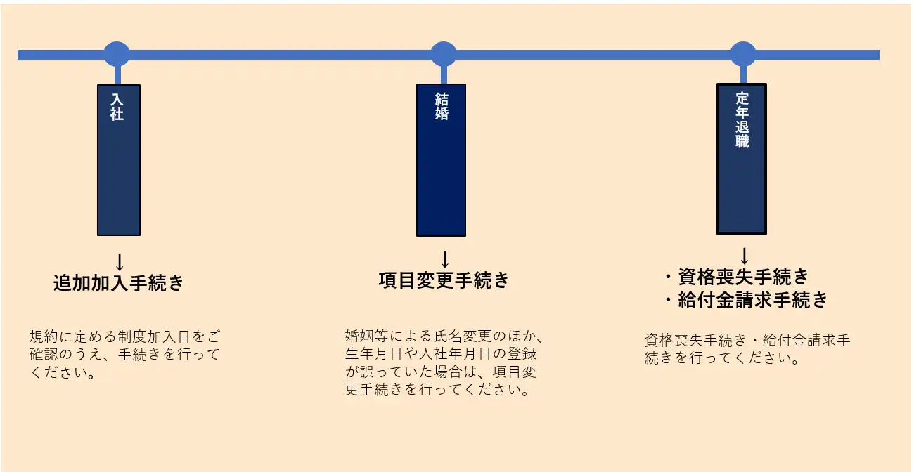 確定給付企業年金は、契約者である団体さまにて、適切に加入者管理に関する事務を行っていただく必要があります。 団体さまにご対応いただく一般的な事務(追加加入・給与更新・財政決算関係)について、 年間事務スケジュールや従業員のライフイベントに沿った事務を掲載しています。