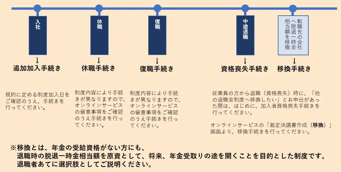 - 追加加入・給付請求手続きの操作マニュアルは、以下の「従業員の方のライフイベントに沿った事務(モデルケース)」に掲載しています。