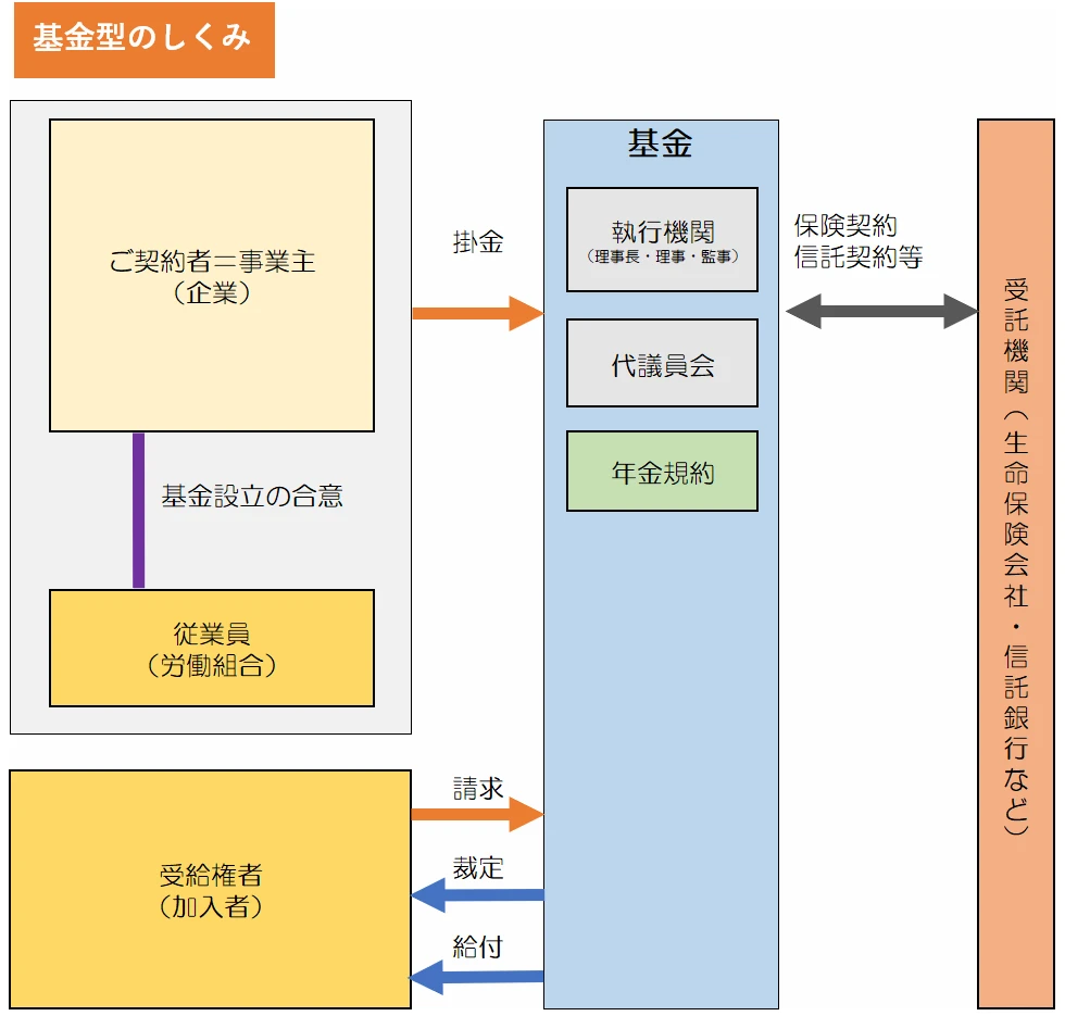 - 基金型は基金が企業(実施事業所)の従業員のために実施する確定給付企業年金制度です。
