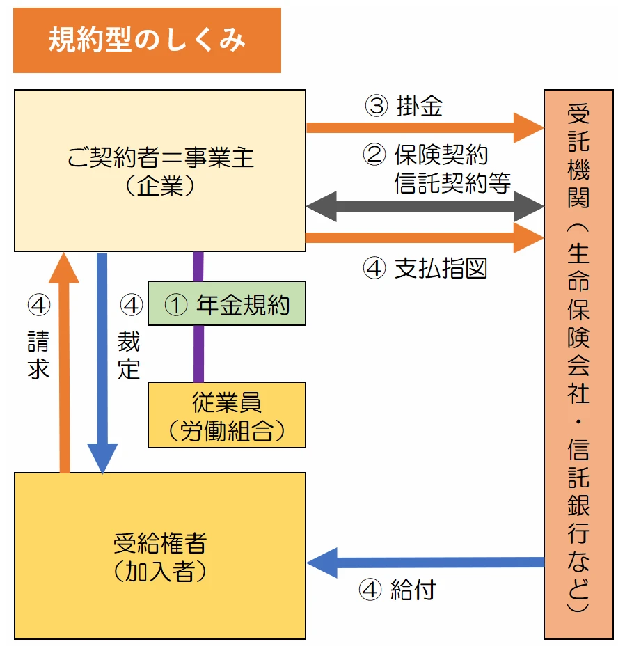 従業員が退職する際に給付請求を行い、企業が給付請求に裁定を行った後、当社に支払指図を行います。年金資産の中から確定給付企業年金規約に基づく年金 (または一時金)を当社が直接受給権者にお支払いします。